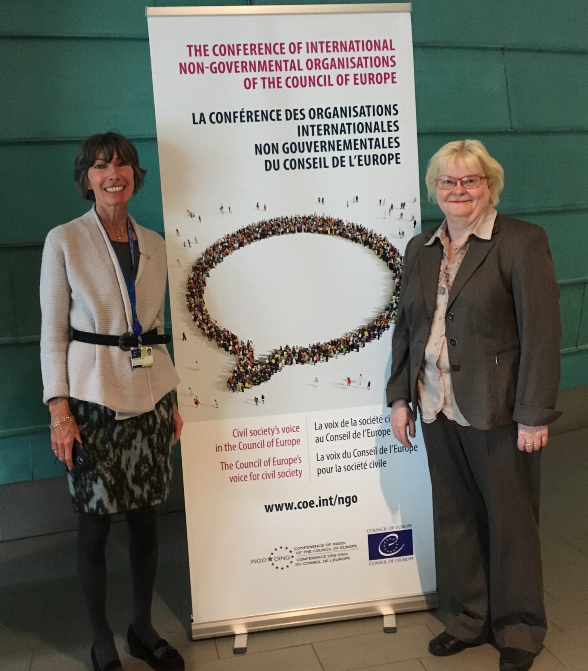 ZI:n Council of Europe Committeen puheenjohtaja Anita Schnetzer-Spranger ja jäsen Tuija Heikkilä Euroopan neuvoston päämajassa huhtikuussa 2019.