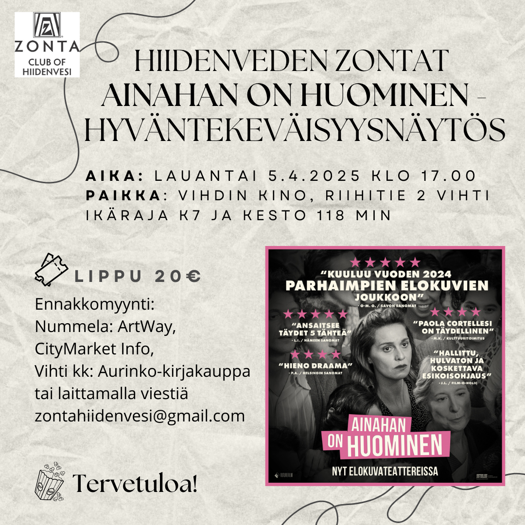 Hiidenveden kerho tarjoaa elokuvaelämyksen ”Ainahan on huominen” lauantaina 5.4. klo 17, Vihdin Kino -
