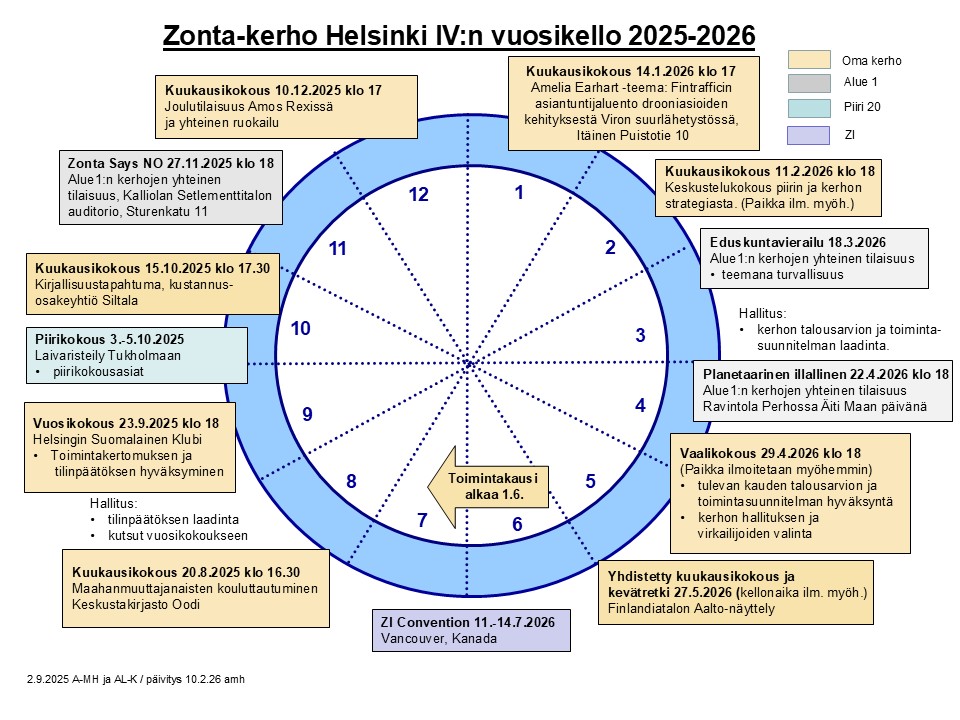 Zonta-kerho Helsinki IV:n kauden 2025- 2026 kuukausikokousten teemat ja alustavat päivämäärät sekä keskeiset kansainväliset, piirin ja alueen tilaisuudet löytyvät vuosikellosta, jota kerhon webmasterit päivittävät tietojen täydentyessä. Tulostettavan version löydät tästä.