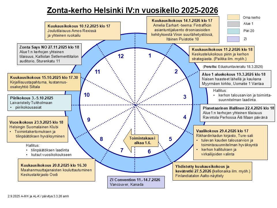 Zonta-kerho Helsinki IV:n kauden 2025- 2026 kuukausikokousten teemat ja alustavat päivämäärät sekä keskeiset kansainväliset, piirin ja alueen tilaisuudet löytyvät vuosikellosta, jota kerhon webmasterit päivittävät tietojen täydentyessä. Tulostettavan version löydät tästä.