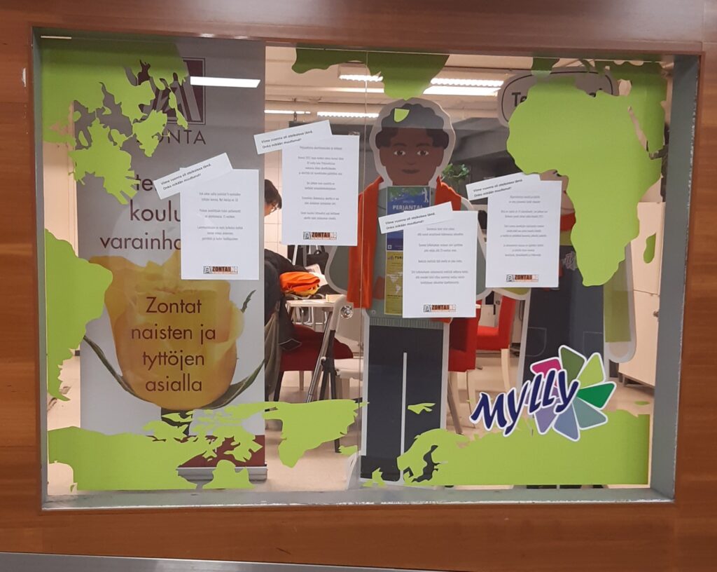 Kotkan zontakerho ripusti 25.11. Monikulttuurikeskus Myllyn ikkunaan kauppakeskus Pasaatiin aiheeseen liittyvän pienen näyttelyn. Jo viime vuonna kokosimme siihen faktoja maailmalta. Ne liittyvät muun muassa lapsiavioliittoihin ja aborttioikeuteen. Tämän vuoden kysymys kuuluu: onko mikään muuttunut?