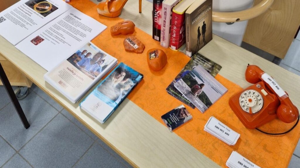 Viimevuotiseen tapaan Salon Zonta-kerho järjesti yhteistyössä Salon kirjastojen kanssa Zonta Says NO -tempaukset. Kaikissa 10 alueen kirjastossa on oranssien päivien 25.11.-10.12. ajan pöytä tai hylly, josta löytyy naisiin ja tyttöihin kohdistuvaan väkivaltaan tai sen ehkäisemiseen liittyvää kirjallisuutta sekä yhteystietoja ja ohjeita väkivallan kohteeksi joutuneille. Kuva on Salon pääkirjastosta.